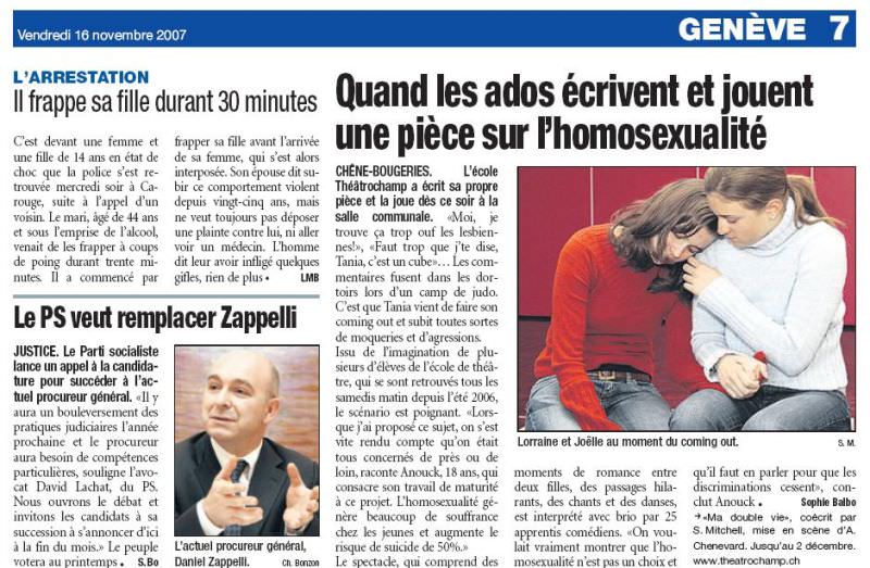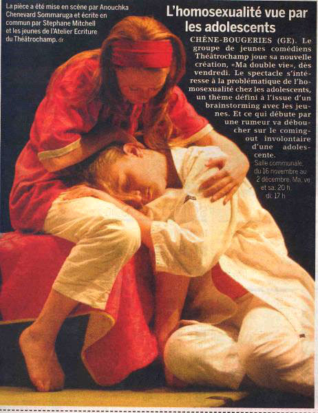 Questionnés sur leurs motivations, filles et garçons nous ont rapporté de multiples histoires concernant l’homosexualité qui touchaient leurs amis, leur famille, leur environnement intime ou social. Soudain les langues se déliaient et il était évident que chacun avait été confronté de près ou de loin à l’ostracisme qui frappe la communauté homosexuelle: les non-dits, les années de mensonge, les doubles vies, les peurs dévorantes, les insultes, les déchirements, les suicides ratés ou malheureusement réussis – une souffrance cachée phénoménale. Face à tous ces témoignages, il nous a paru indispensable de relever le défi et traiter de ce thème brûlant pour la prochaine création du Théâtrochamp.