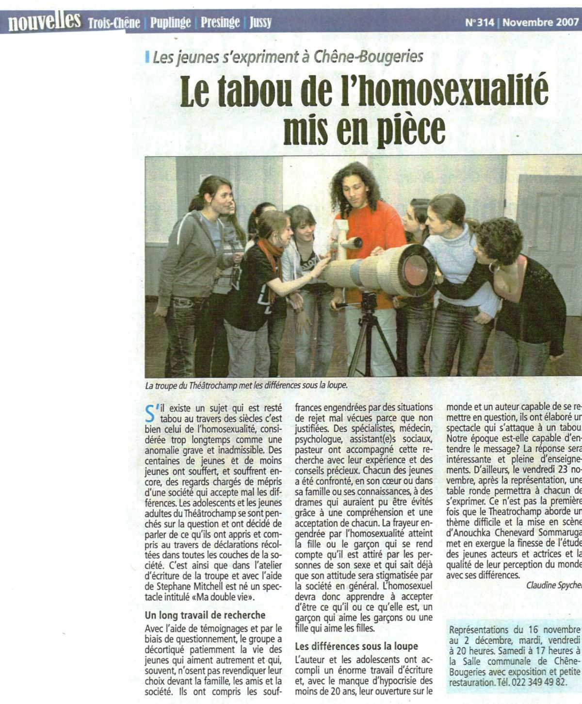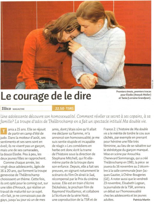« Ma double vie » est né de ces témoignages de souffrance et du questionnement du groupe d’adolescents et jeunes adultes de Théâtrochamp. Chacun avait de près ou de loin été confronté à l’ostracisme qui frappe la communauté homosexuelle et leurs proches : les non-dits, les années de mensonge, les doubles vies, les peurs dévorantes, les insultes, les déchirements, les suicides ratés ou malheureusement réussis. Les jeunes voulaient écrire une pièce sur ce sujet brûlant.